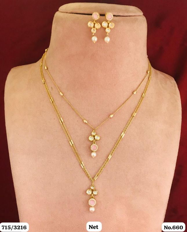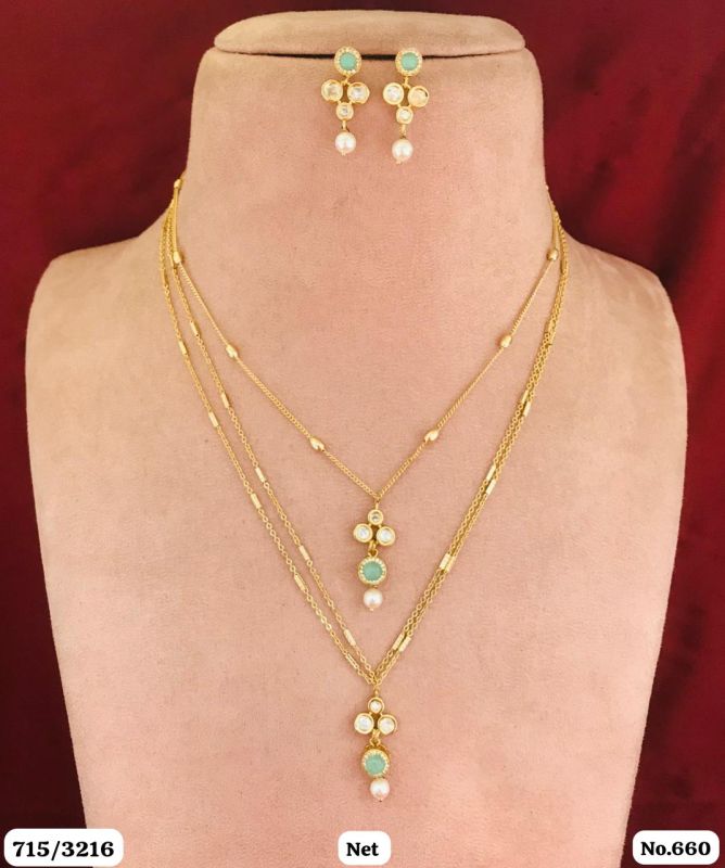 We offer an elegant collection of gold-plated imitation necklace sets with matching earrings, designed for both casual and festive occasions. Each set is finely crafted with premium-quality gold plating, colored stones, and pearl drops to give a traditional yet modern appeal.